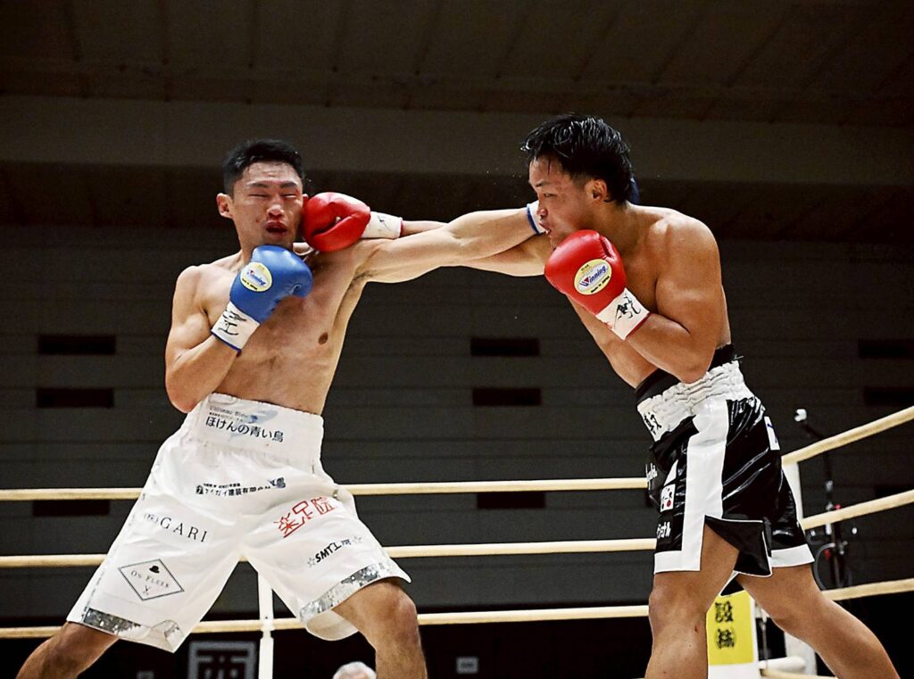 セミファイナルに出場した柴田尊文は、対戦相手 濱島選手の凄まじい気迫に立ち向かい、激闘の末にKOで勝利することができました。
